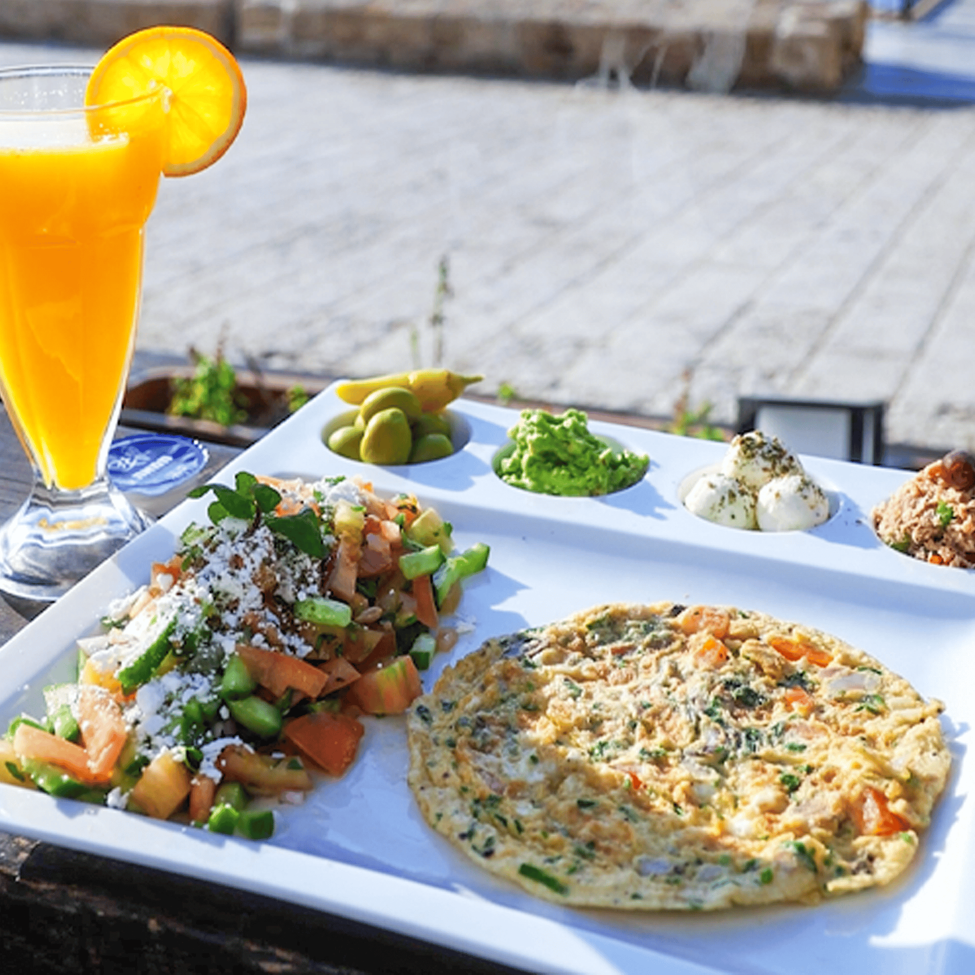 סלט קצוץ/ תבולה, לחם לבן/ שחור דגנים, בליווי סט מטבלים: לבנה עם שמן זית וזעתר/ סלט טונה/ אבוקדו/ גבינות/ זיתים.